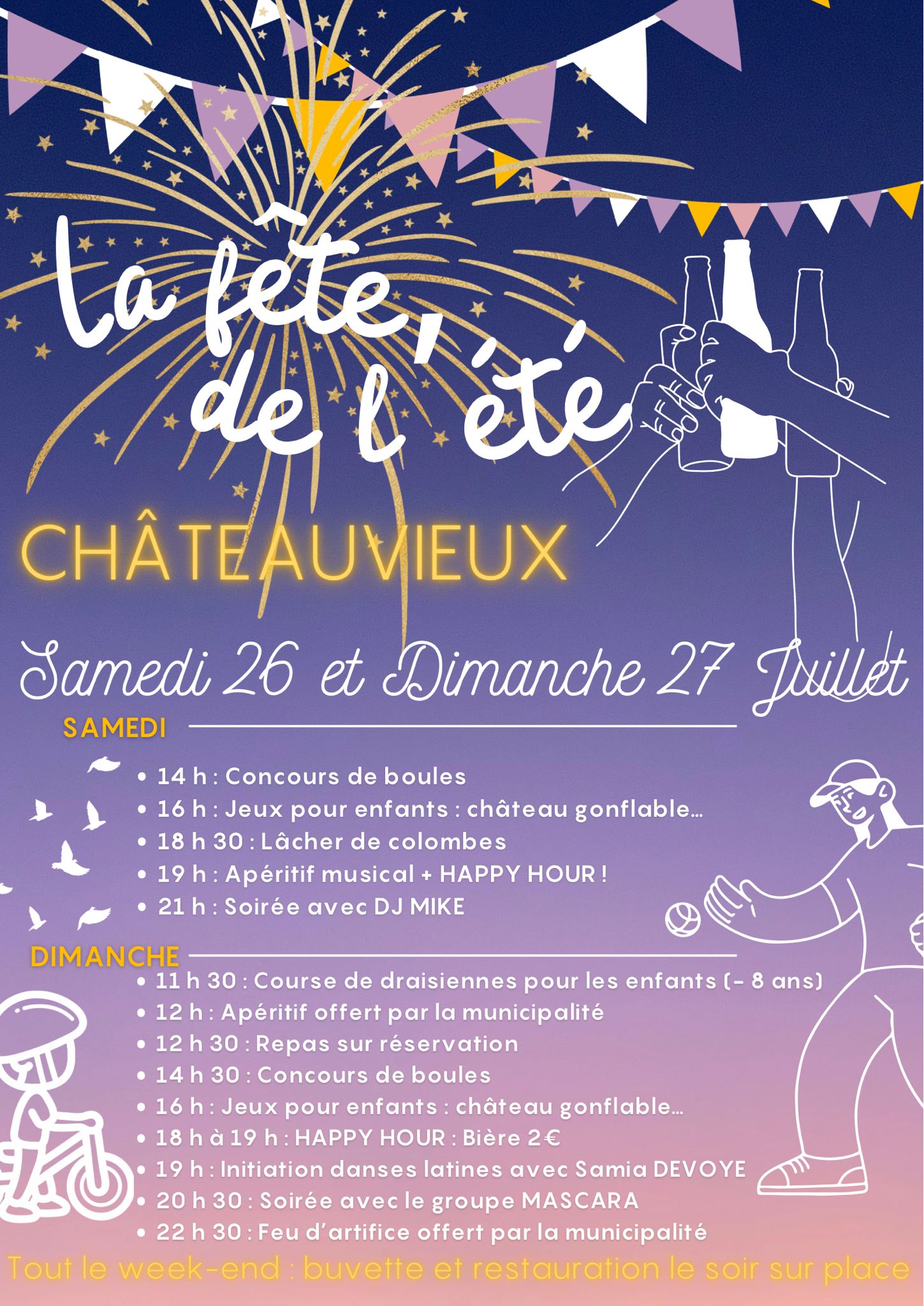 - 12h30 : Repas des Châteauviards sur réservation : Repas au feu de bois : Carottes rapées + gratin dauphinois + rôti de porc + fromage + tarte aux fruits + café = 18€