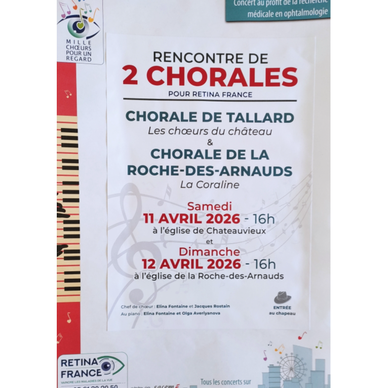 La Chorale des Chœurs du Château de TALLARD et la Chorale La Coraline de LA ROCHE-DES-ARNAUDS vous proposent un concert, en l'église Sainte-Foy, au profit de la recherche en ophtalmologie (RETINA France).